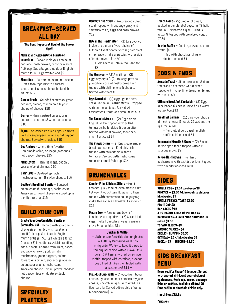 The magic starts with their specialty platters, where you can dive right into the Country Fried Steak, a sumptuous 8oz. breaded cubed steak topped with rich sausage gravy, served alongside two eggs and crispy hash browns for just $18. If you're seeking something unique, the Hole in the Head Platter is a culinary twist with an egg cooked in the center of buttered toast, paired with your choice of meat and hash browns for $12.50. For those navigating the weekend blues, their Hangover dish is an absolute lifesaver—two eggs, any style, and savory sausage patties on a hearty bed of hash browns.